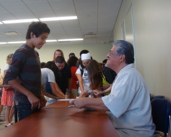 Poet Luis Rodriguez signs his book for a young fan at the Fullerton Public Library in Fullerton, California.